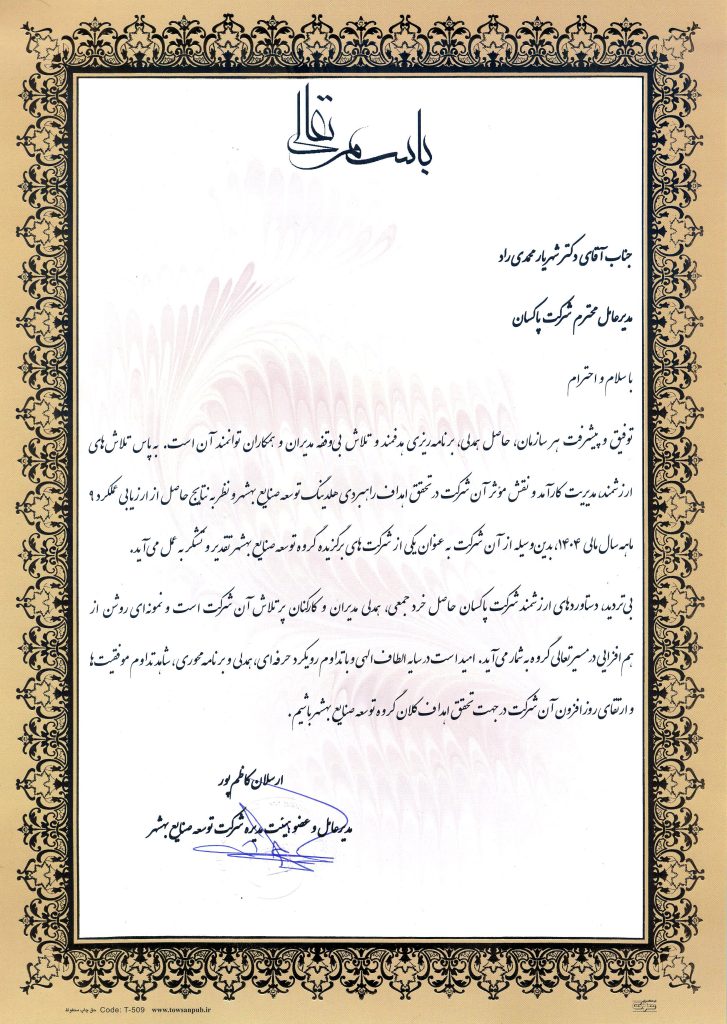 قدردانی از پاکسان به‌عنوان شرکت‌ برتر در ارزیابی هلدینگ توسعه صنایع بهشهر