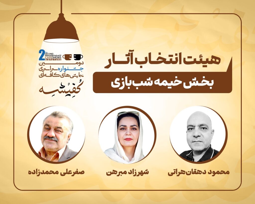 اقتصاد زمانه : با صدور احکام دبیر دومین جشنواره سراسری نمایشهای کافهای «کفیشه»، اعضای هیأت انتخاب در سه بخش «کافهای»، «نقالی و پردهخوانی» و «خیمهشببازی و عروسکهای سایه سنتی» معرفی شدند.